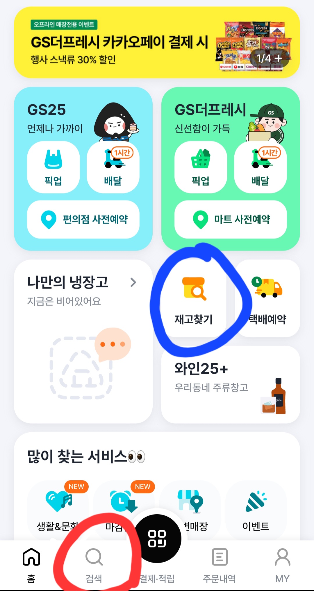 우리동네GS 인기검색어 1위 푸바오 재고찾기 or 검색 파란색으로 표시한 재고찾기는 개별 편의점 재고 확인가능한 기능으로 로그인 없이 가능합니다.